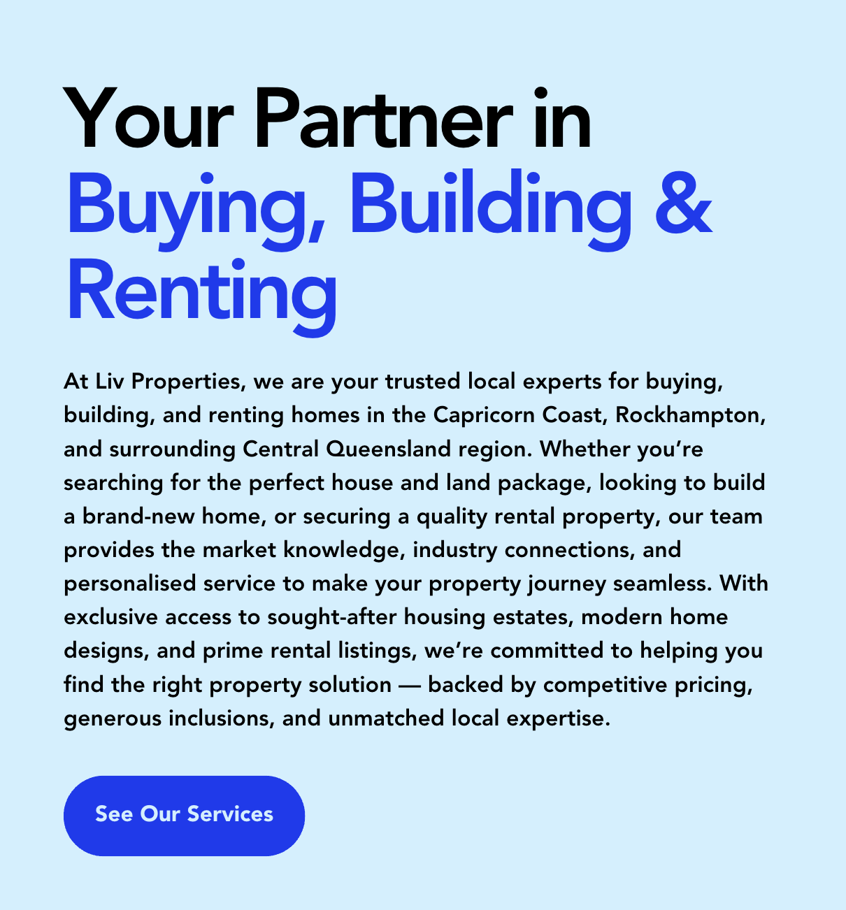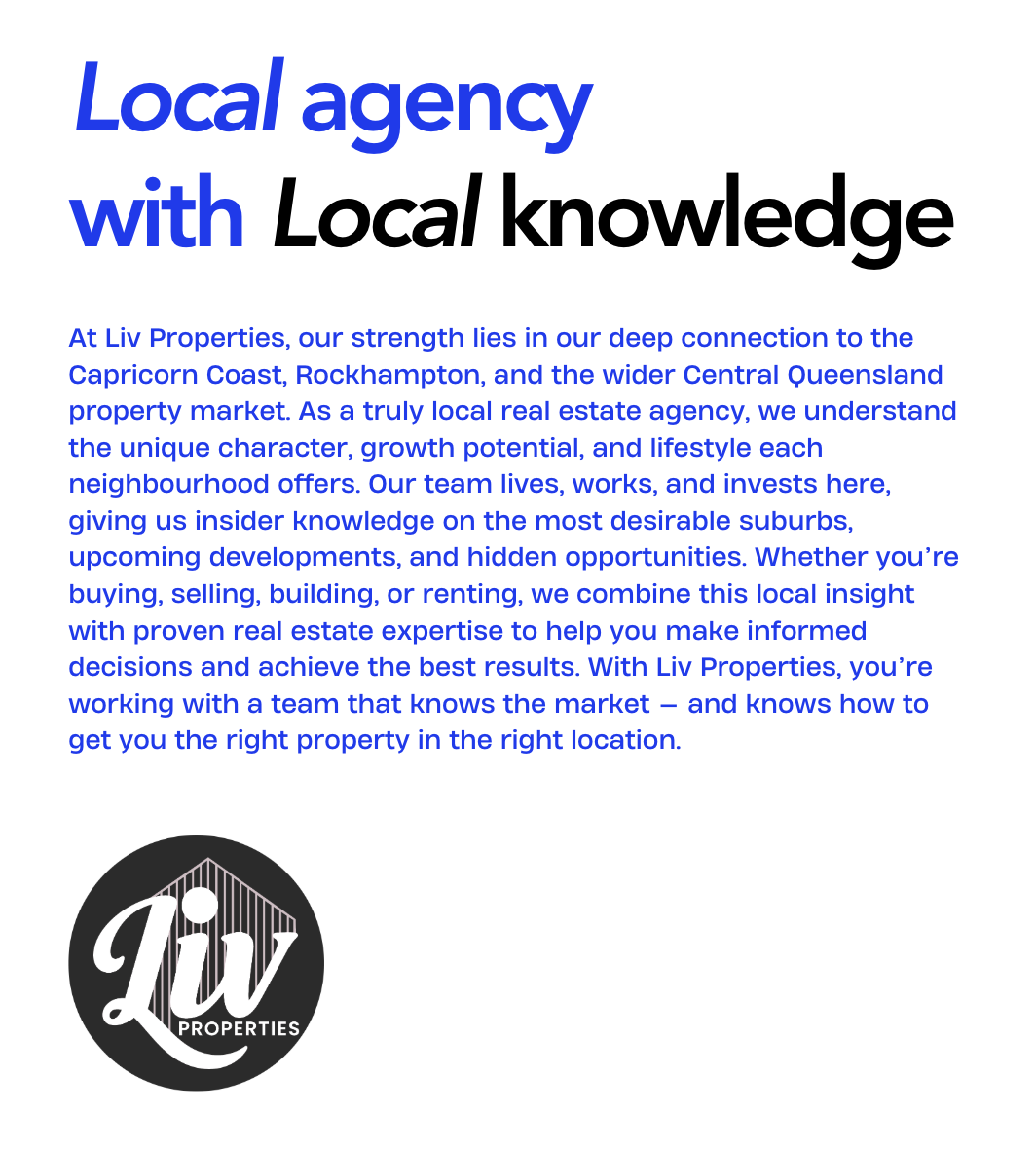 Liv Properties is a trusted real estate agency specialising in house and land packages, residential sales, and property leasing across the Capricorn Coast and Rockhampton region.